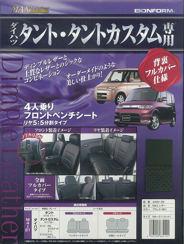 ダイハツ タント・タントカスタム専用 マックスレザーシートカバー ブラック M4-21 価格: 6,900円 レビュー評価: 5.0 レビュー数:1 ◇車種別シートカバー「MAX Leather(マックスレザー)」◇◇ダイハツタント・タントカスタム[M4-21]◇ブラック[BK]◇ ディンプルレザーと上質レザーとのシックなのコンビネーション! ◇大垣産業 BONFORM [M4-21]◇シート背裏/フルカバー仕様フロント席・・・ベンチシート ※5速MT車には、お取付け頂けません。リヤ席・・・5:5分割タイプ(肘掛付)◇品質/合成皮革●レザー生地のシフトノブカバーが付属しています。※対応については画像・下記適合表等でご確認下さい。 また、記載以外のグレード・年式のお車にはお取付けいただけませんので予めご了承ください。 ●買い物フック付のお車 Supported by 楽天ウェブサービス |
